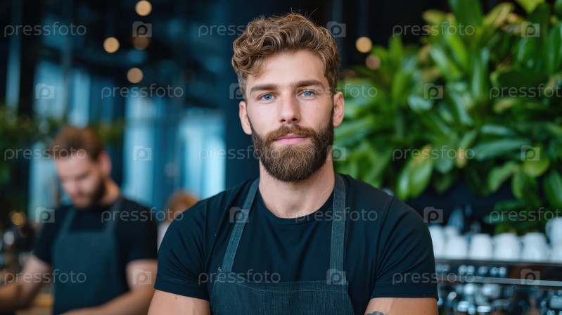Сосредоточенные бариста в фартуках готовят кофе в шикарном кафе, демонстрируя преданность и профессионализм