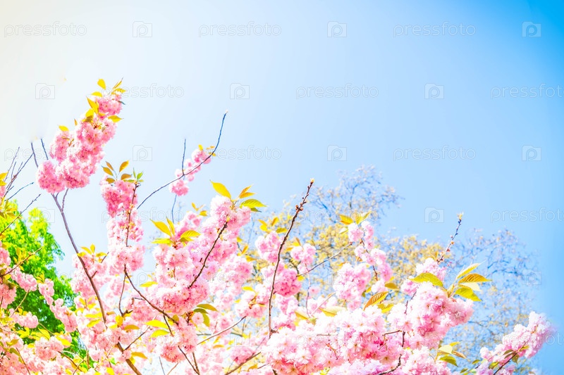 Сакура-вишенка цветущее дерево над небом, розовое облако цветков