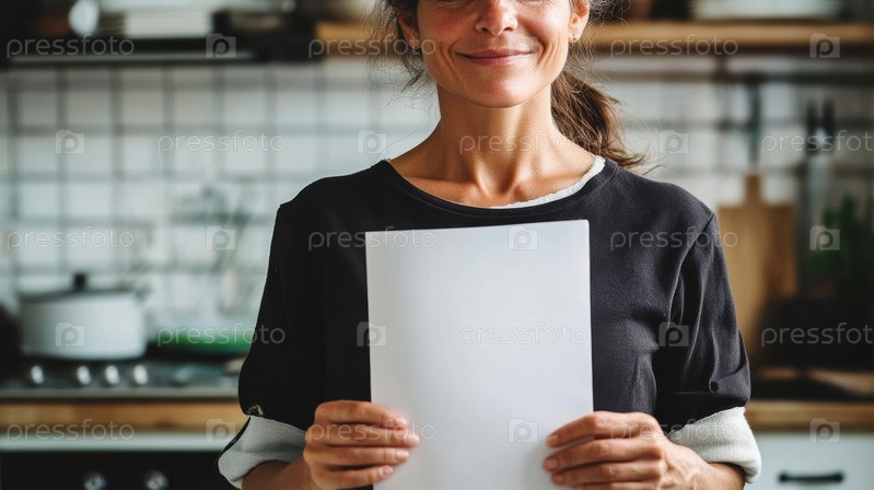 Веселая женщина стоит на своей прекрасной кухне, уверенно держит в руках белый лист бумаги и стремится к творческим идеям