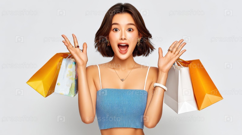 Взволнованная молодая женщина радостно держит сумки для покупок, демонстрируя свое подавляющее счастье во время покупки