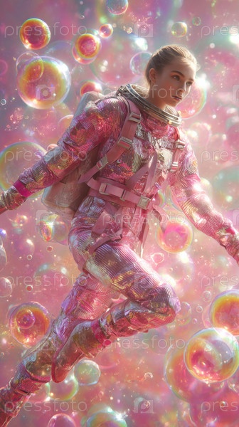 Шикарный и стильный астронавт, одетый в блестящий розовый костюм, плавает в окружении красочных и ярких пузырей