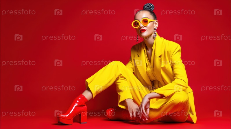 Стильный человек в желтом костюме и красных солнцезащитных очках излучает уверенность на ярко-красном фоне