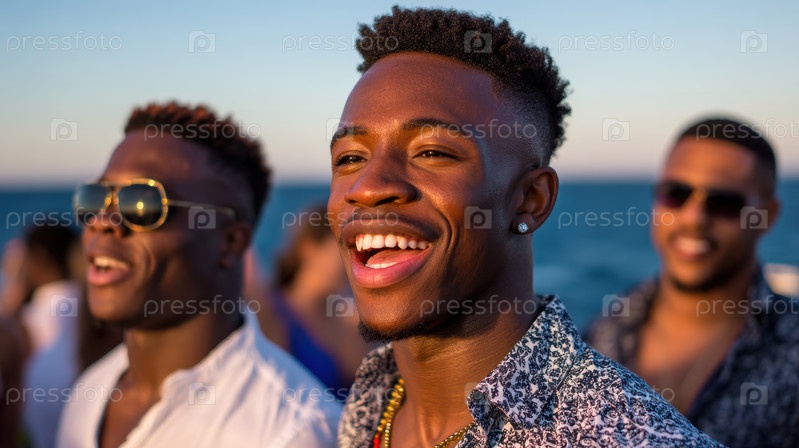 Счастливый улыбающийся мужчина в красочной тропической рубашке наслаждается веселой летней вечеринкой на лодке с друзьями и напитками