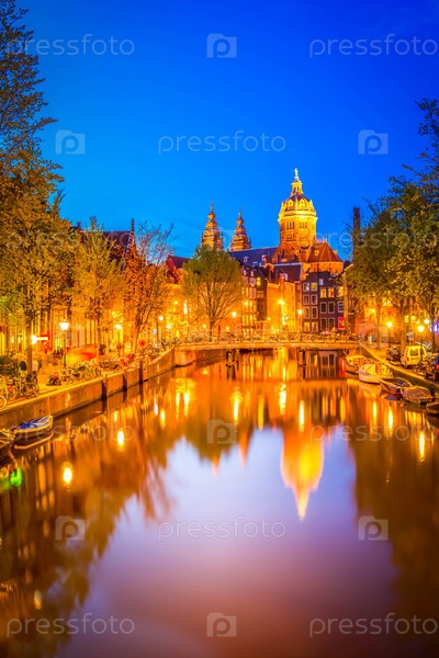 Церковь Святого Николая над старым городским каналом ночью, Амстердам, Голландия Нидерланды