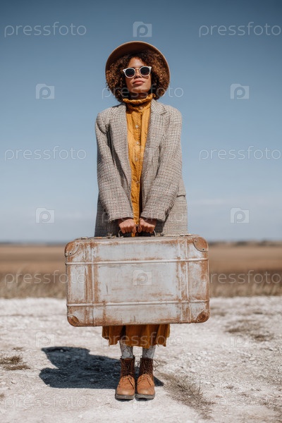 Женщина, изящно одетая в винтажный наряд, держит чемодан в красивой сельской местности