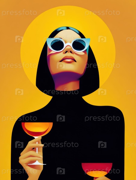Стильная женщина блаженно наслаждается освежающими напитками в модных солнцезащитных очках на смелом фоне захода солнца