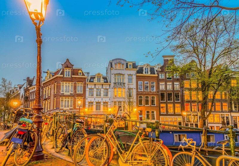 Дома и велосипеды с яркими огнями ночью, Амстердам, Нидерланды