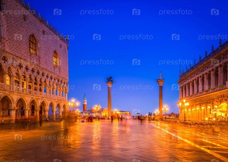 Площадь Сан-Марко с двумя колоннами ночью, Венеция, Италия