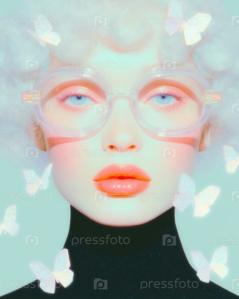 Стильный и художественный портрет с моделью, одетой в блестящие солнцезащитные очки рядом с нежными бабочками