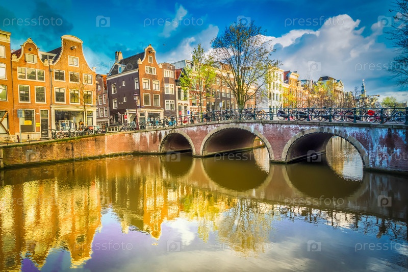 Голландский пейзаж с отражением канала и зеркала на весне, Амстердам, Нидерланды