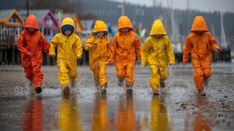 Дети, одетые в красочные яркие платья от дождя, с радостью брызгут пудрами в прекрасный дождливый день