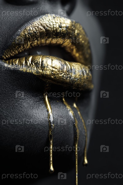 Впечатляющий крупный план черных губ, украшенных блестящей золотой краской, демонстрируя художественное творчество