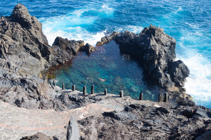 Женщина плавает в бассейне с природными скалами в Атлантическом океане, Канарские острова Тенерифе