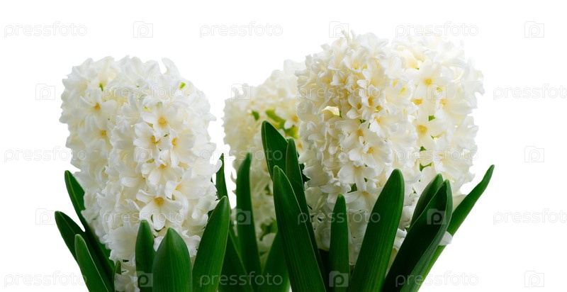 Белые гиацинтовые цветы выложены в ряд на ярко-белом фоне, росатые зеленые листья, ближайшая ботаническая композиция передает свежий весенний настроение, highkey