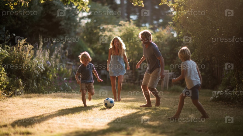 Увлекательный семейный опыт Дети с энтузиазмом играют в футбол в красивой солнечной среде