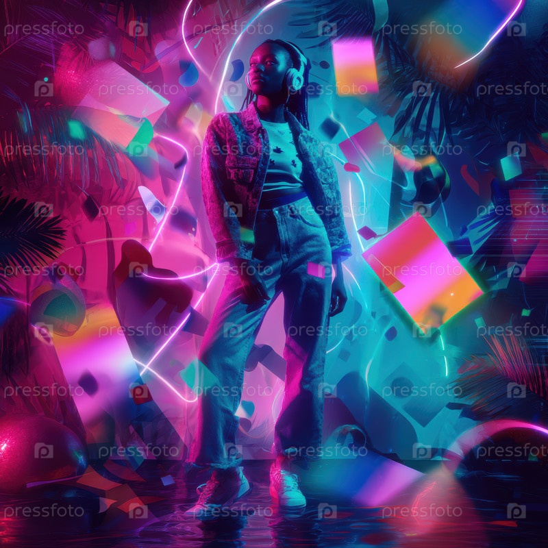 Современная фигура стоит среди взрыва цвета и абстрактных форм, воплощая творчество