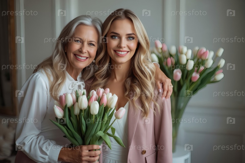 Концепция праздника, посвященного Международному женскому дню 8 марта.Два поколения женщин.Молодая женщина с букетом тюльпанов в сопровождении пожилой матери