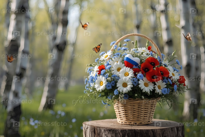 Концепция празднования Дня России - красивый, легкий и воздушный букет белых ромашек, красных маков и голубых кукурузных цветов в плетеновой корзине на стебле березового леса