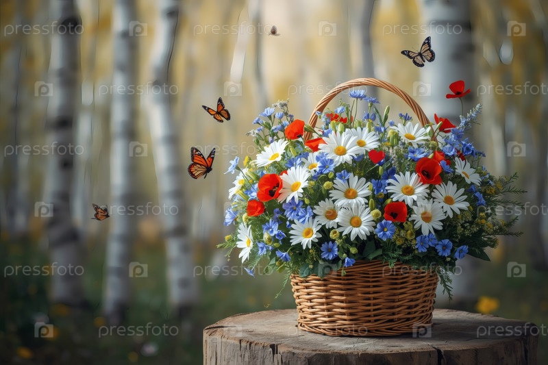 Концепция празднования Дня России - красивый, легкий и воздушный букет белых ромашек, красных маков и голубых кукурузных цветов в плетеновой корзине на стебле березового леса