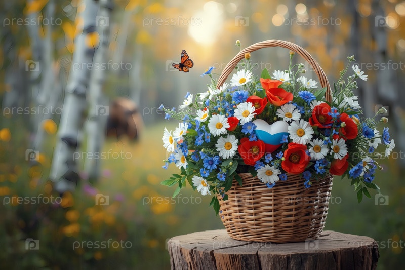 Концепция празднования Дня России - красивый, легкий и воздушный букет белых ромашек, красных маков и голубых кукурузных цветов в плетеновой корзине на стебле березового леса с медведем на заднем плане