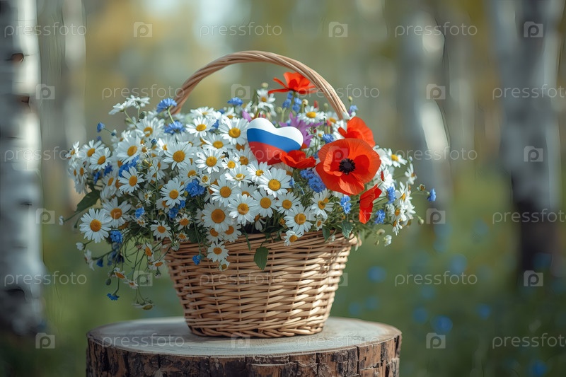 Концепция празднования Дня России - красивый, легкий и воздушный букет белых ромашек, красных маков и голубых кукурузных цветов в плетеновой корзине на стебле березового леса