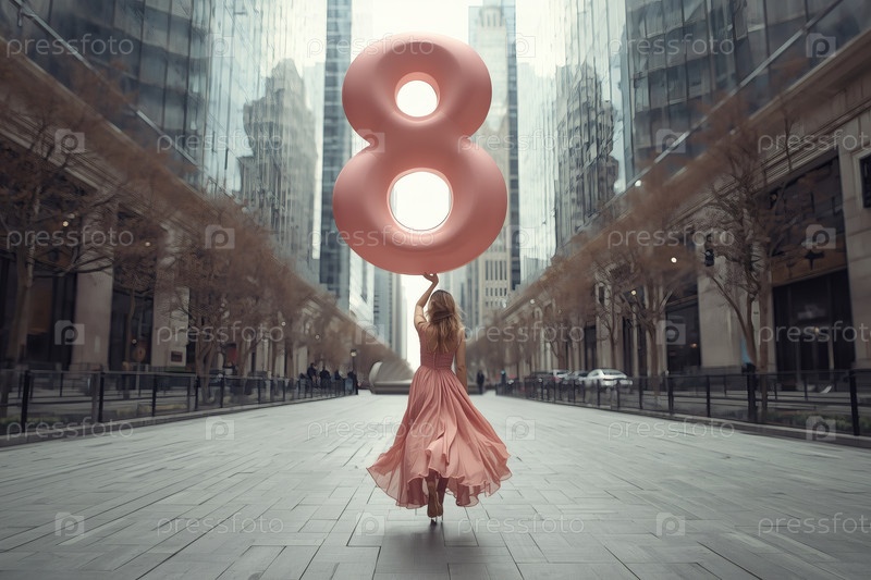 Концепция праздника, посвященного Международному женскому дню 8 марта.Женщина в розовом платье держит огромный шар в форме восьмерки на улице города, окруженной небоскребами