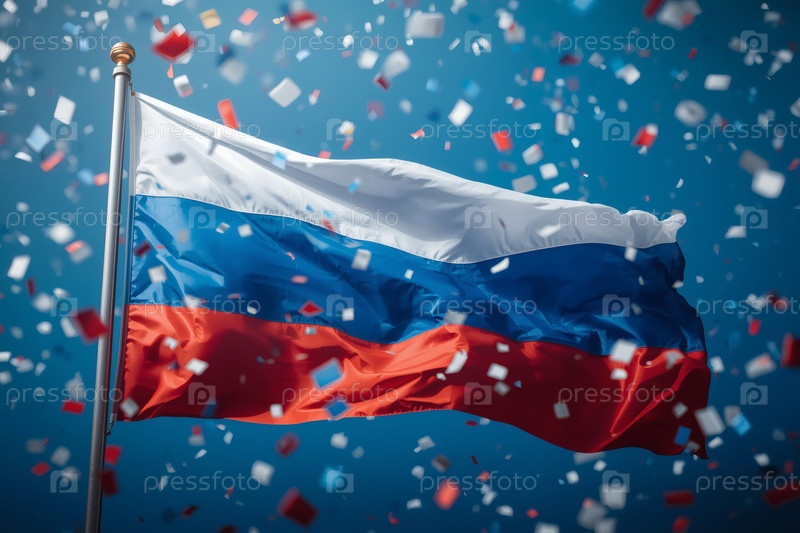 Концепция празднования Дня России 12 июня.Государственный флаг Российской Федерации.Русский триколор с красочными конфетти