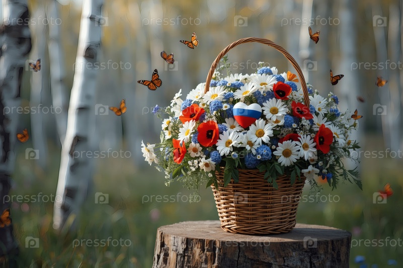 Концепция празднования Дня России - красивый, легкий и воздушный букет белых ромашек, красных маков и голубых кукурузных цветов в плетеновой корзине на стебле березового леса