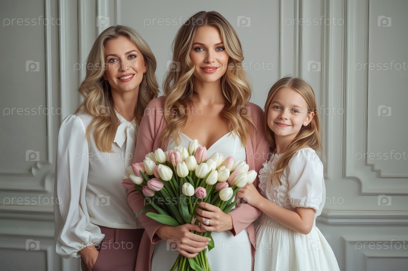 Концепция праздника, посвященного Международному женскому дню 8 марта.Три поколения женщин.Молодая женщина, несущая букет тюльпанов, в сопровождении пожилой матери и маленькой дочери