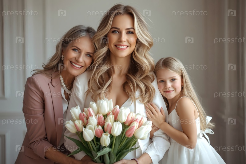 Концепция праздника, посвященного Международному женскому дню 8 марта.Три поколения женщин.Молодая женщина, несущая букет тюльпанов, в сопровождении пожилой матери и маленькой дочери