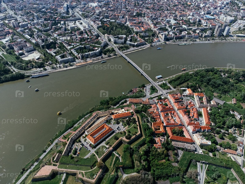 Зональный снимок с дронов крепости Петроварадин, расположенной на берегу реки Дунай напротив Нови-Сада. Сербия