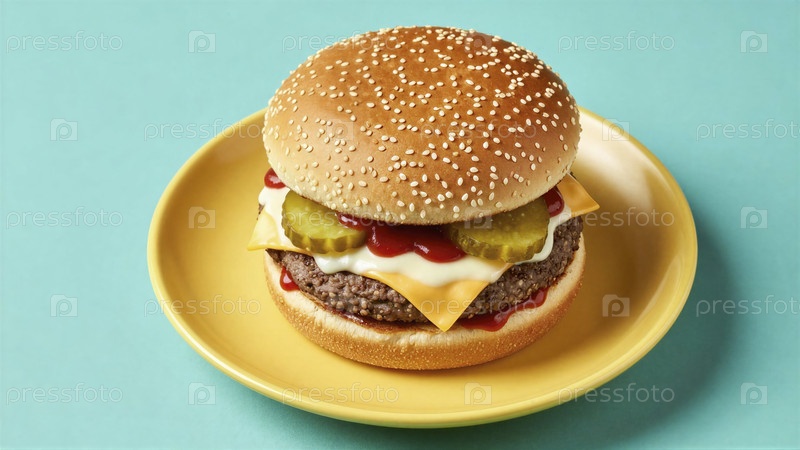 Вкусный чизбургер на желтой тарелке