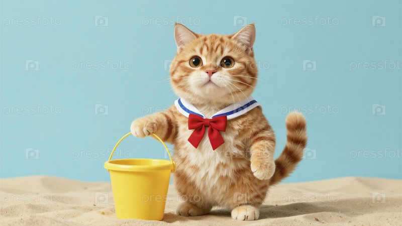 Очаровательный кот в костюме моряка с желтой ведрой на пляже
