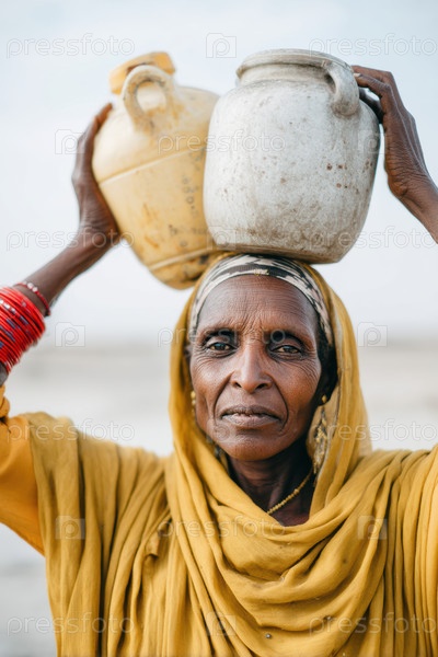 Устойчивая женщина несет воду в желтых контейнерах через трещины земли, подчеркивая дефицит воды