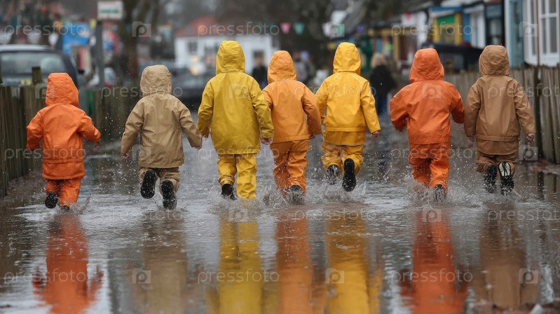 Дети, одетые в красочные яркие платья от дождя, с радостью брызгут пудрами в прекрасный дождливый день