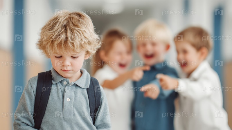 Ученик сталкивается с издевательствами, когда одноклассники высмеивают его в школьном коридоре, подчеркивая проблему школьного домогательства