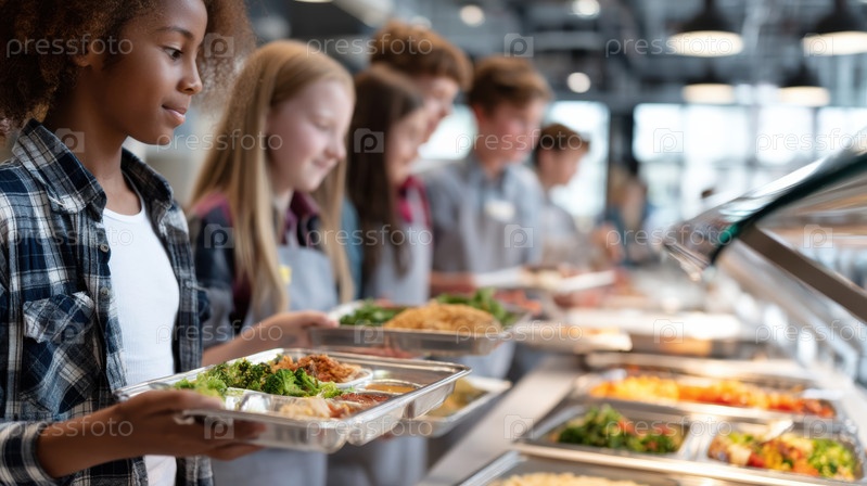 Учащиеся счастливо наслаждаются разнообразными здоровыми блюдами в школьной столовой каждый день