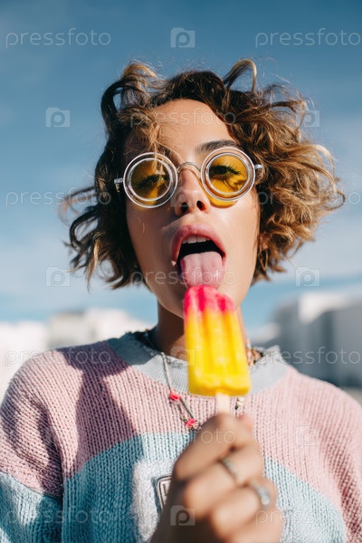 Стильная молодая женщина радостно наслаждается красочным мороженым, наслаждаясь прекрасным солнечным пляжным днем