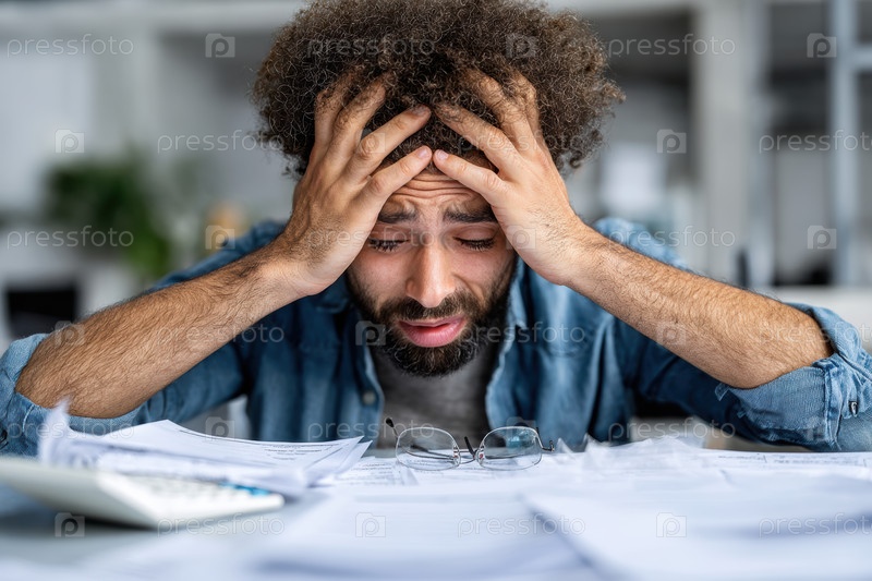 Стрессованный мужчина сидит за своим столом, в окружении скрученных бумаг и документов, подавленный давлением