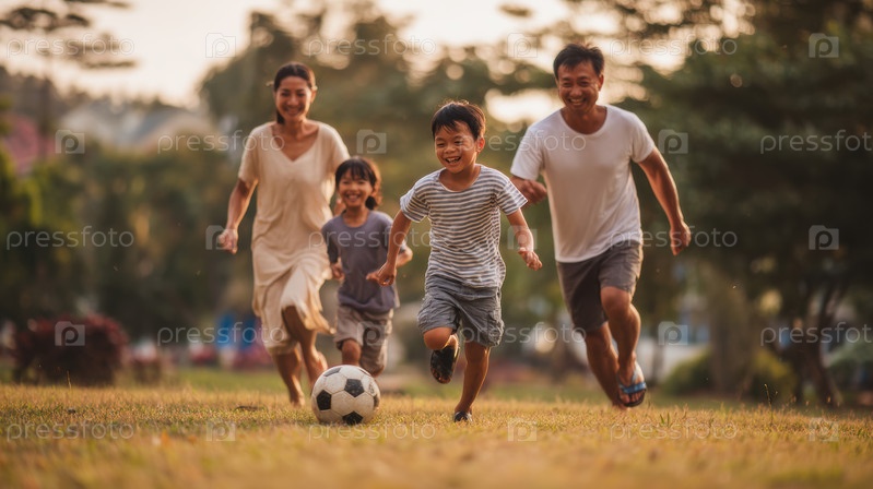 Веселая семья счастливо наслаждается оживленной игрой в футбол вместе на своем просторном заднем дворе под теплым солнцем