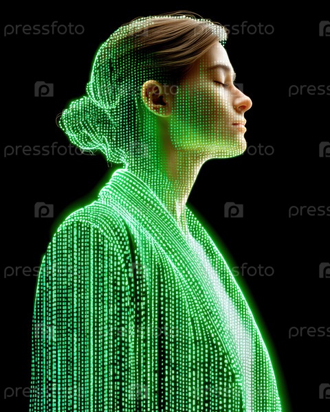 Потрясающая и поразительная модель элегантно демонстрирует яркое зеленое платье на фоне увлекательного цифрового матричного фона