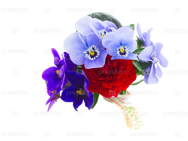 Деликатный букет панси и роз, расположенных на откровенно белом фоне, ярко-фиолетовые панси и одна красная роза, мягкое затенение, атласовая лента, цветочный образец