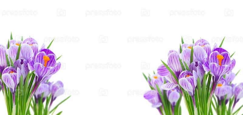 Близкая студия натюрморта показывает скопированные цветы крокуса с полосыстыми листьями, свежими зелеными листами и видимой пыльцой