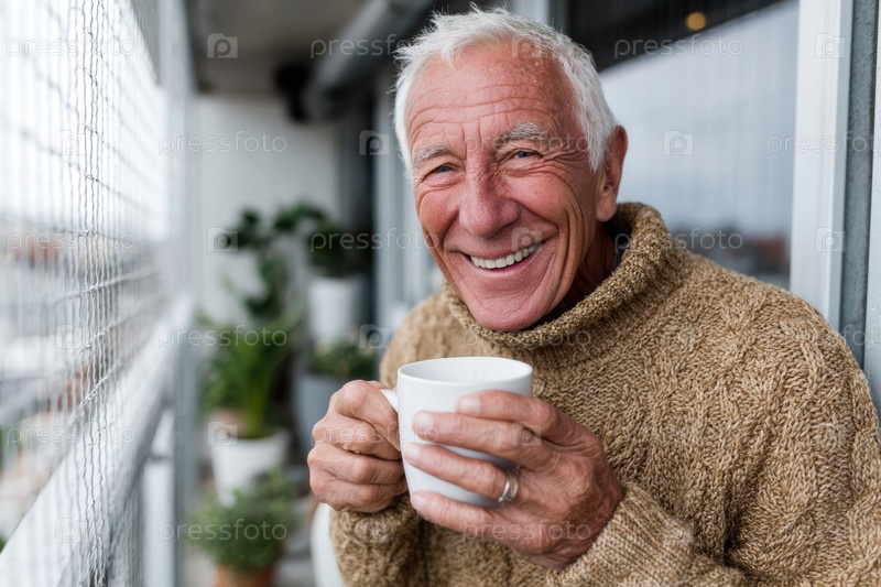 Веселый пожилой человек с теплой улыбкой удовлетворенно наслаждается чашечкой кофе в уютной помещенной среде