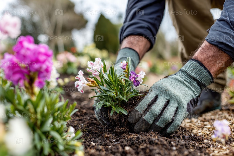 Садовник радостно сажает красочные и красивые цветы в цветущем саду