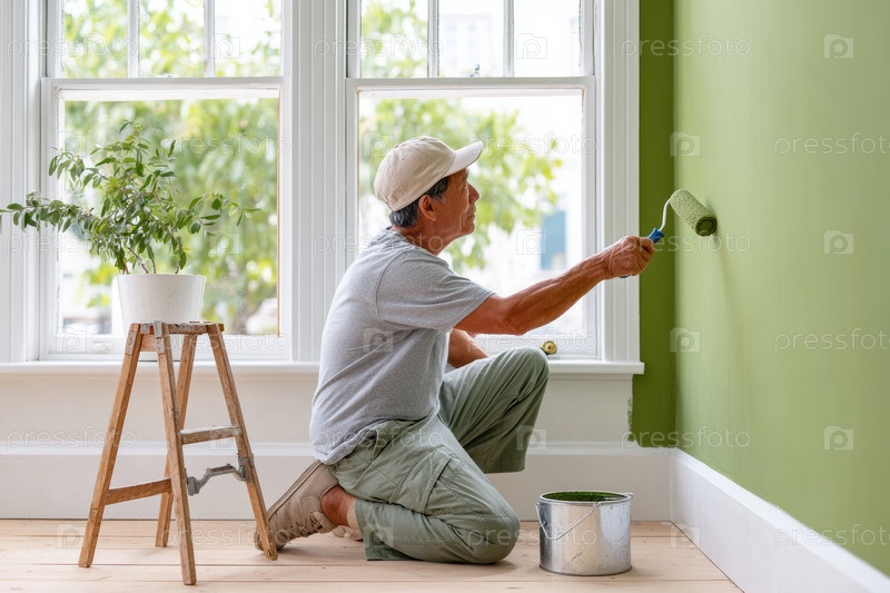 Человек умело рисует стену в современной комнате с яркой и чистой эстетикой