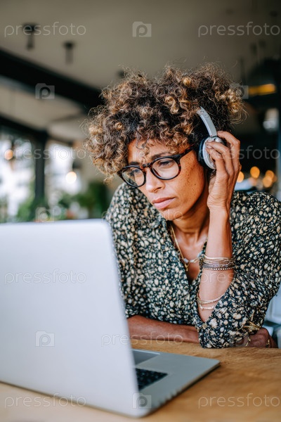 Фокусированный профессионал, занимающийся работой на ноутбуке внутри модного современного кафе