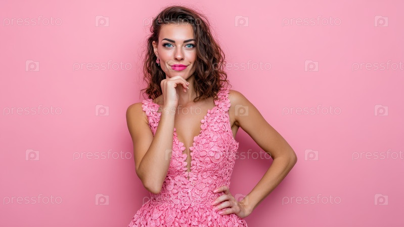 Стильная и стильная модель одета в великолепное розовое платье на мягком розовом фоне Chic