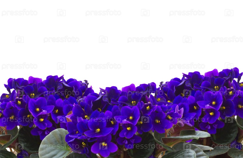 Фиолетовое африканское фиолетовое растение в горшке компактная розетка блестящих зеленых листьев, кластеры темно-фиолетовых цветов с желтыми центрами, студийный белый фон, мягкий