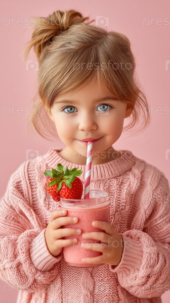 Очаровательная девушка радостно держит вкусный клубничный смузи с яркой улыбкой, идеально подходит для маркетинговых целей